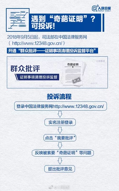 9月5日,司法部举行新闻发布会,会上介绍,为了广泛倾听民意,接受群众对地方和部门设立的“奇葩证明”、循环证明、重复证明等问题的投诉,司法部在中国法律服务网(12348中国法网)上正式开通“群众批评——证明事项清理投诉监督平台”,群众可通过网站和手机客户端提出意见建议,司法部要求地方在15天内反馈,特殊情况下,可以延长至20天。