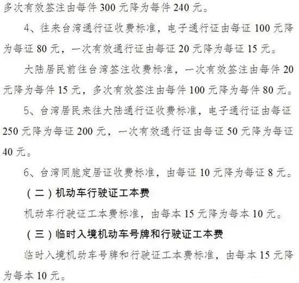 《通知》部分截图 普通护照等一批收费将降低 国家发改委、财政部29日对外下发通知,自2017年7月1日起,降低公民出入境证件费、机动车行驶证工本费、临时入境机动车号牌和行驶证工本费等收费标准。 其中,普通护照收费标准,由每本200元降为每本160元。出入境通行证收费标准,一次出入境有效由每证20元降为每证15元;多次出入境有效由每证100元降为每证80元,长期(三年以上,含三年)多次有效签注由300元降为240元。 往来港澳通行证收费标准,由每证100元降为每证80元。前往港澳通行证收费标准,由每证50元降为每证40元。往来台湾通行证收费标准,电子通行证由每证100元降为每证80元,一次有效通行证由每证20元降为每证15元。 此外,机动车行驶证工本费、临时入境机动车号牌和行驶证工本费由目前的每本15元降为每本10元。 记者注意到,国家旅游局的数据显示,2016年中国出境旅游人数达1.22亿人次。因此,此次公民出入境证件费用的降低,对于打算出境旅游的人来说,可以少花一笔钱了。